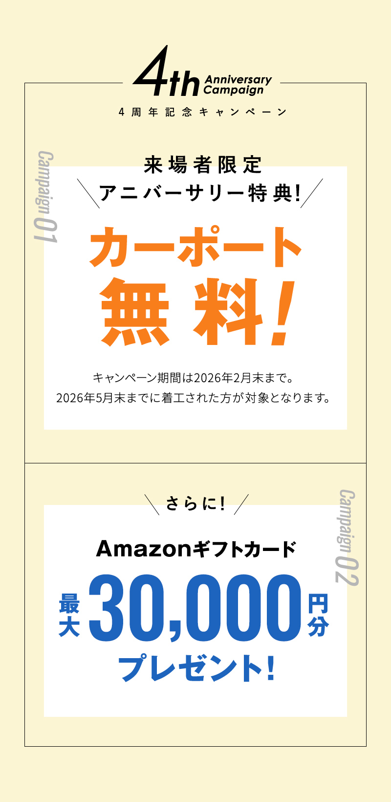 ✔予約フォームからご予約の上、お住まい予定の世帯全員での来場、来場時身分証提示、事前アンケート実施、来店後アンケート実施でAmazonギフト10,000円