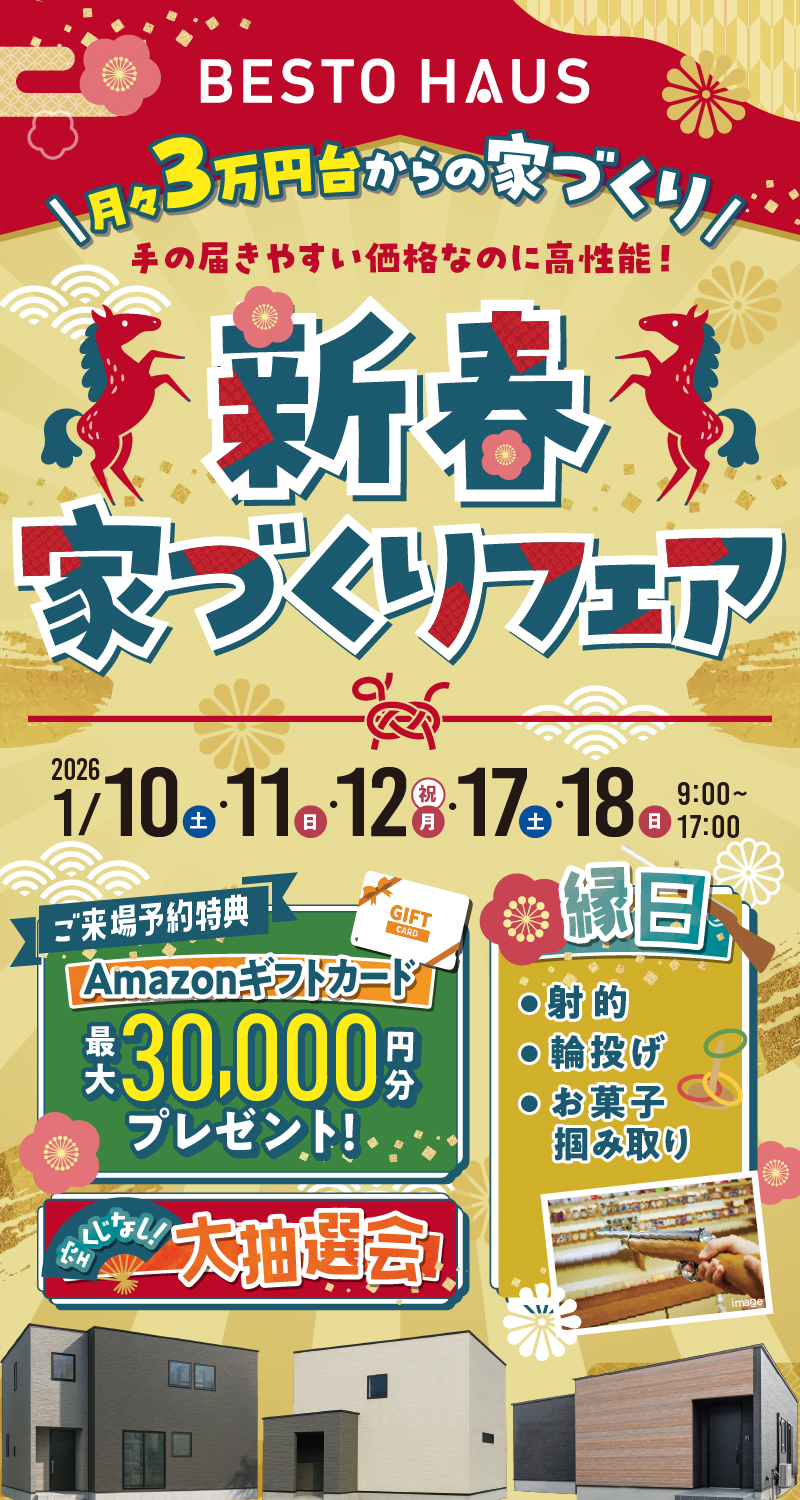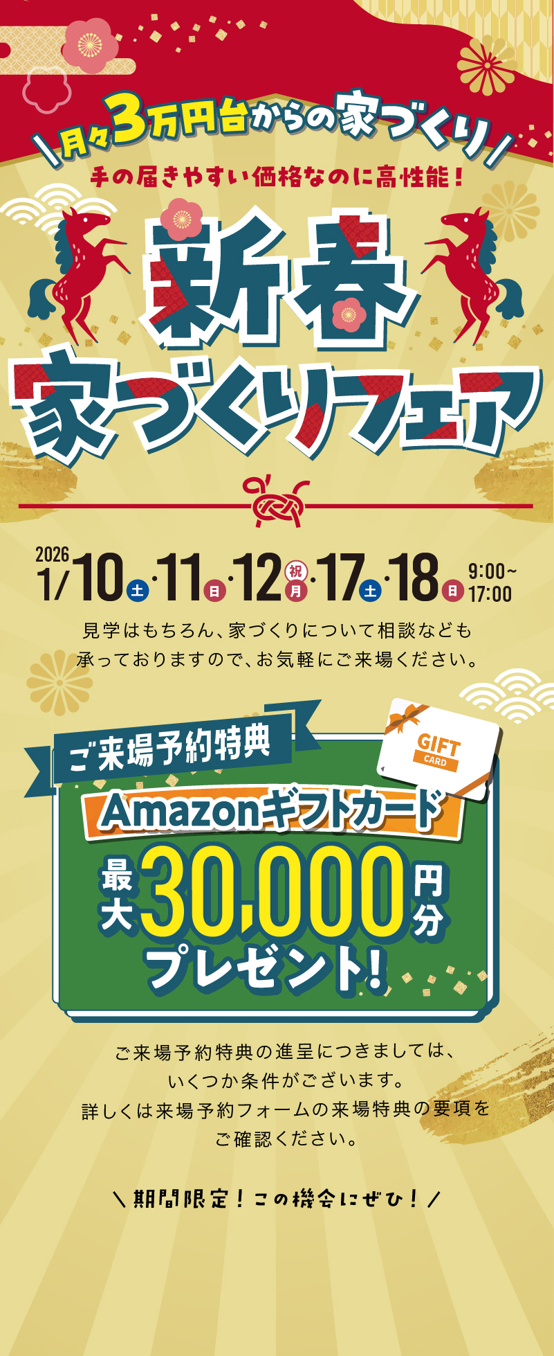 ✔予約フォームからご予約の上、お住まい予定の世帯全員での来場、来場時身分証提示、事前アンケート実施、来店後アンケート実施でAmazonギフト10,000円